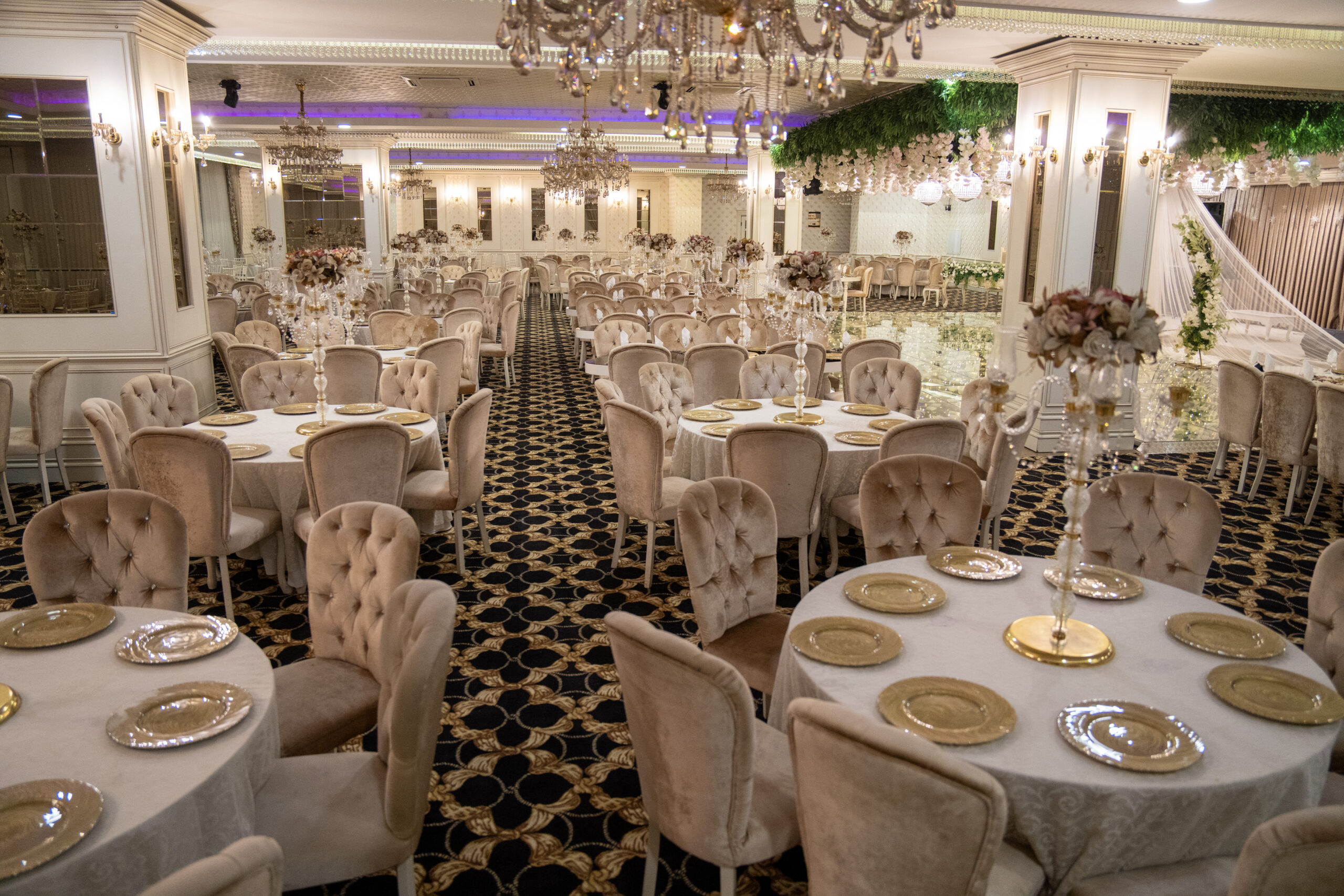 Altın tonlarının hâkim olduğu lüks salon, geniş kapasitesi ve otel tarzı dekorasyonuyla büyük davetler için ideal